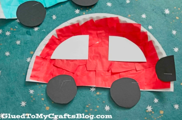 - Cut tissue paper into small squares and then help your little one glue the pieces all over the paper plate half.