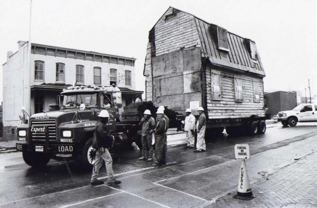 Tucker Cottage on a flat-bed truck getting moved to Chamberlayne Parkway in 2004. Workers are helping with the move on foot. From the Theodore Holmes Collection, Richmond Public Library.